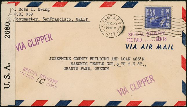 This cover was sent airmail, special delivery from APO 959, Wheeler Field, Oahu by a civilian, probably a military contractor, in August of 1942.