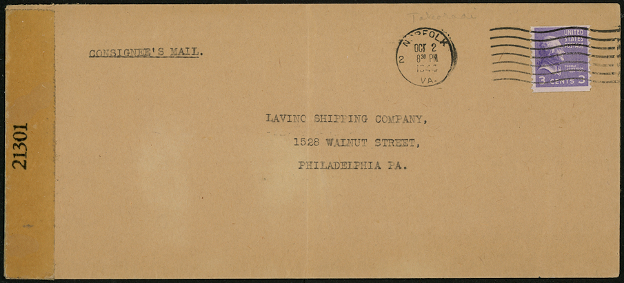 This cover was handed to U.S. Customs from some unspecified source in 1940. From the only handstamp on back, Customs examined it and passed it on to be censored. It entered the mails in Norfolk, where the three cent stamp was added and cancelled.