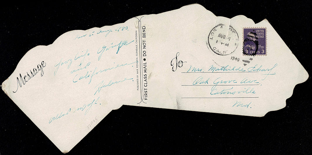 Postcards over a particular size required first class postage. This one, mailed in 1940, ran into that rule by measuring over five and 9/16 inches in length.