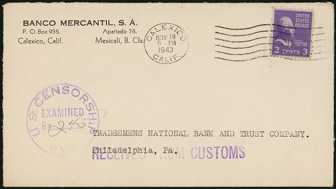 Another cover handed to customs, in this case at Calexico on the California-Mexico border. Customs examined and passed it, but it still received civil censorship in Los Angeles.