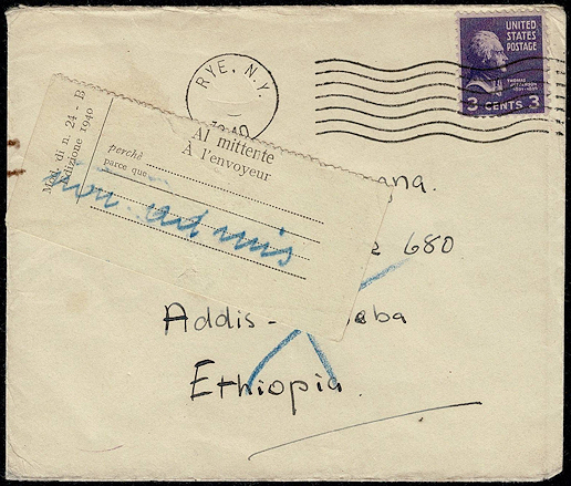 Christmas cards could be sent abroad at the printed matter rate if they did not contain more than five words of conventional greeting handwritten in them. This card, sent to Ethiopia in 1940, must have weighed slightly over two ounces, so it was sent for three cents. It was returned to sender as non-admissable for some reason.