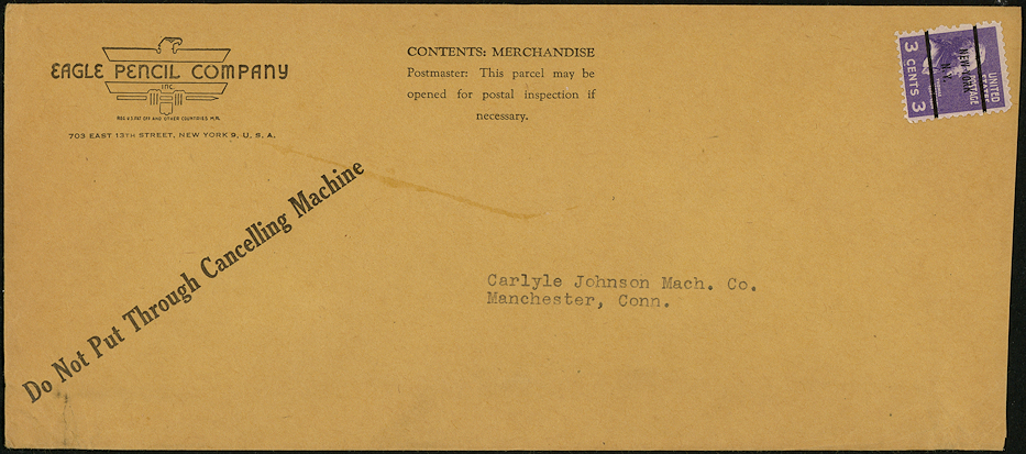 A three-cent Prexie was used to forward printed matter from Russia in 1949. Third class postage was two cents for the first two ounces and one cent for each additional ounce, so the item in this wrapper must have weighed between two and three ounces.