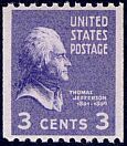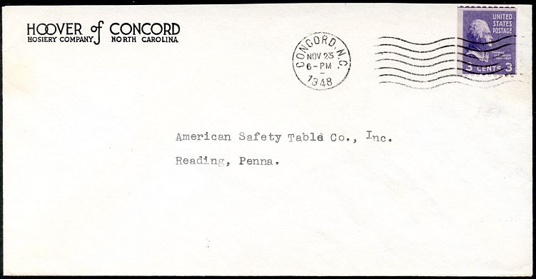 Three-cent vertical coil use on a mailing in 1948. The color on the top perforations shows that the stamp was printed just below the rotary press joint line.