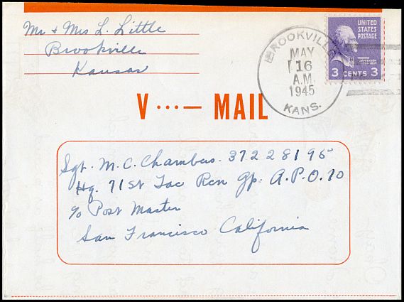 V-Mail was introduced on June 15, 1942 as a way to cut down on the weight and volume of paper being moved back and forth between people in the United States and members of the Armed Forces abroad during World War II. A one-page letter could be sent to an Army Postal Service processing center to be photographend and placed on microfilm. When it reached its destination it would be printed out and sent to the addressee. The surface rate to the processing center in the United States was three cents.
