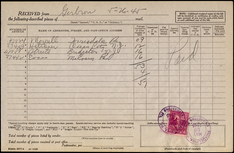 A certificate of mailing cost one cent per item from July 1, 1929 until February 1, 1954. This page is a shipping receipt for four pieces of mail.