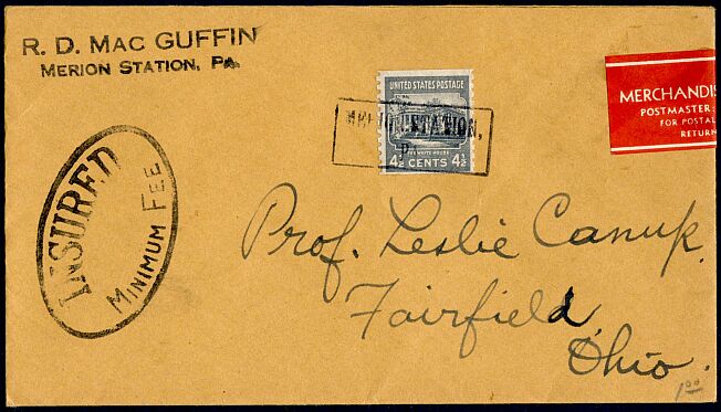 A four-and-one-half-cent Prexie coil stamp used to pay the third-class rate of one-and-one-half cents plus the three cents minimum insurance fee. This combination was possible from November 1, 1944 through December 31, 1948.