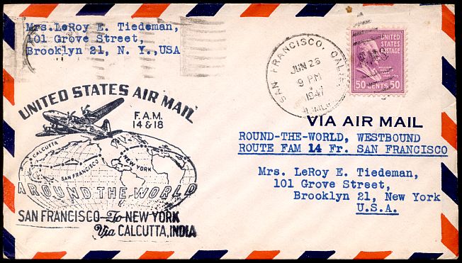Fifty cents per half ounce was the special cost to mail a souvenir cover on the first Foreign Airmail Flight around the world on June 26, 1946.