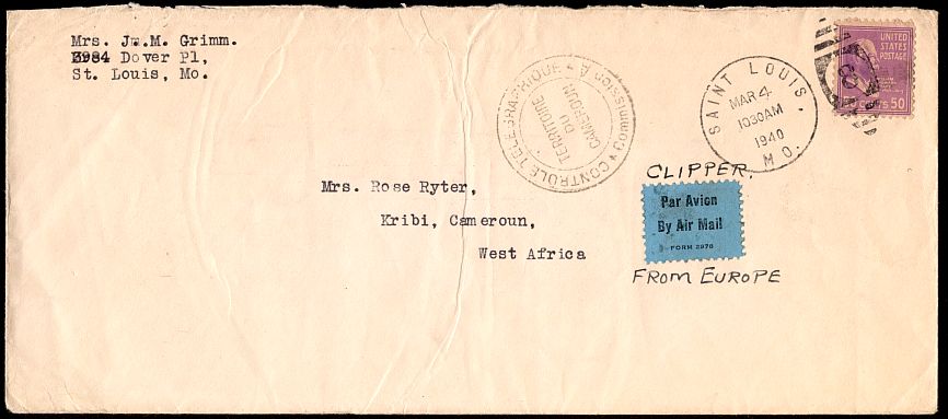 A cover sent to Kribi, Cameroun in March of 1940. It was sent March 4, and is backstamped at Douala, Cameroun on March 31.