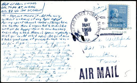 The domestic air mail post card rate was five cents from August 1, 1958 through January 6, 1963. By the time this rate went into effect the five-cent Monroe Prexie issue had been replaced by the Liberty Series five-cent Monroe, but supplies of the earlier issue were still available in some locations. The Air Force postal service in Japan was one such, and that is where this post card was mailed, using the domestic rate.