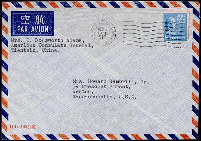 A five-cent Prexie was used to send this letter by air from a U.S. military post office in Tientsin, China in 1948. The sender was with the consulate there, and was able to use the military concession air mail rate in effect from October 1, 1946 until December 31, 1948. The U.S. Army had a presence in Tientsin briefly after the end of the Second World War, but left by the end of 1949 after the fall of the city to the Red Army in January of that year.