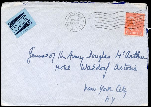 This cover was sent to General Douglas MacArthur in 1954 by someone at the French Embassy in Washington.
