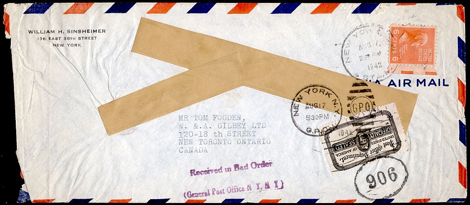 This cover was received in bad order and patched up to be sent to Ontario in August of 1942. Oddly enough, there is no evidence that it was censored.