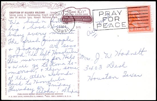 The air mail rate for post cards was six cents from January 7, 1963 until January 7, 1968. Since six-cent coil stamps were produced as late as 1960 it is only mildly surprising that this post card from Hawaii was mailed in 1964 using one.