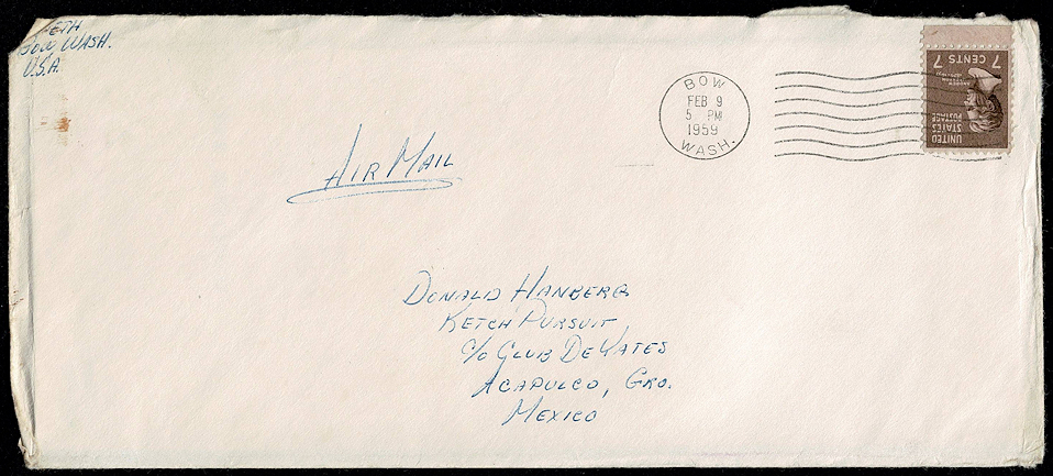 This cover enclosed a valentine sent to Acapulco in 1959 using a Prexie. The seven cent Woodrow Wilson definitive of the Liberty Series had been issued in January of 1956, but seven cent Prexies were being delivered to post offices as late as 1958.