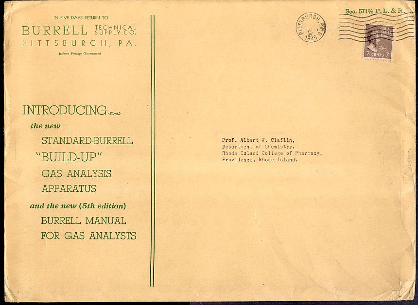 Several combinations of weight and distance resulted in seven cents postage for fourth class bound printed matter at various times. This is an example of a mailing of under or equal to one pound to Zone 4 between March 26, 1944 and January 1, 1949.