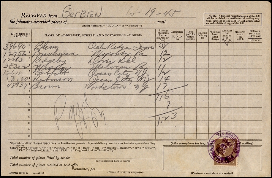 A certificate of mailing cost one cent per item from July 1, 1929 until February 1, 1954. This is a shipping receipt for seven pieces of mail.
