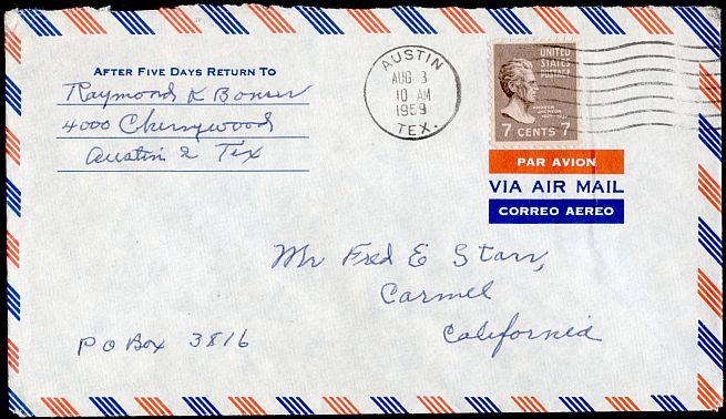 A seven-cent Prexie was used to pay the domestic air mail rate in effect from August 1, 1958 through December 31, 1962.