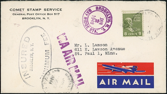 This mailing from the Comet Stamp Service was sent airmail with minimum insurance in January of 1948.