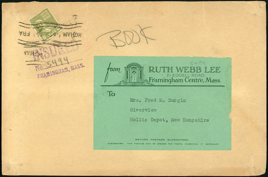 Ruth Webb Lee published handbooks on Victorian pattern glass and valentines during the 1930's and 1940's. These weighed more than four ounces, so this mailing was quite likely to have been done under the book rate rather than as double third class. The combination of postage and insurance dates it from 1942 to early 1944.