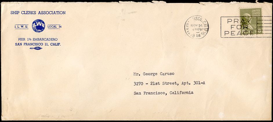 This double weight letter was sent within San Francisco in November of 1958 for eight cents.