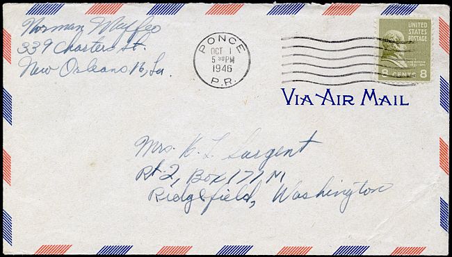 The airmail rate between the continental U.S. and Puerto Rico was eight cents per half ounce from January 15, 1945 until October 1, 1946.