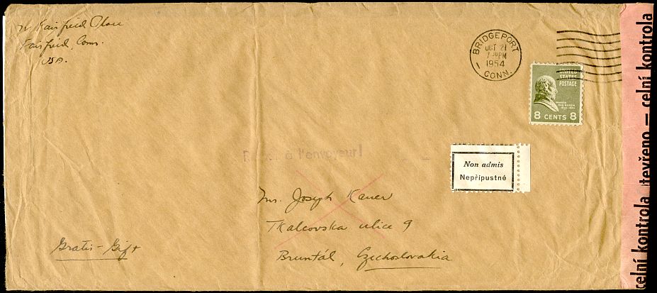 The first ounce international surface rate to a UPU member state was eight cents from Novenber 1, 1953 through June 30, 1961. This cover, sent to Czechoslovakia in 1954, was censored by customs and contained an item that was not allowed.