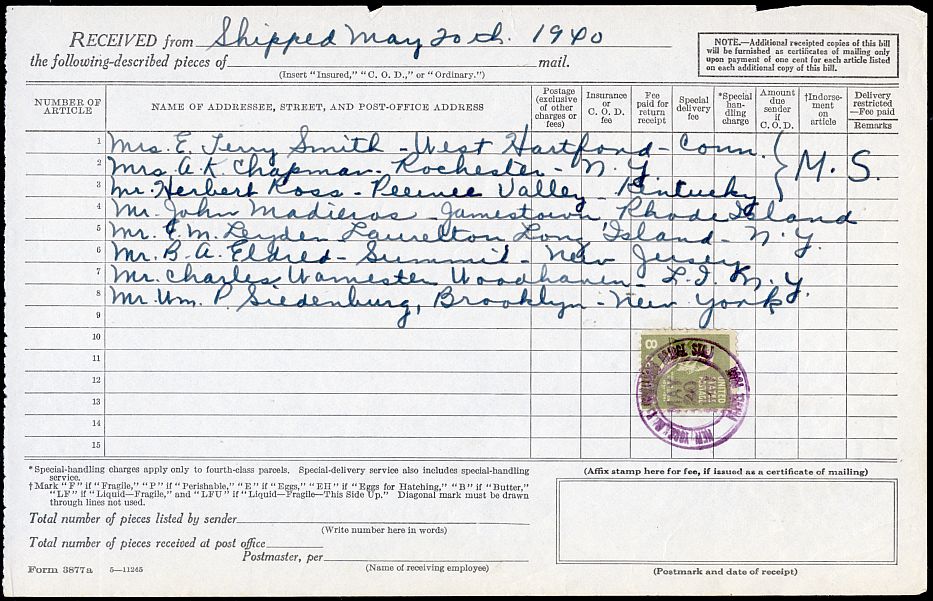 A certificate of mailing cost one cent per item from July 1, 1929 until February 1, 1954. Mailing books could serve as certificates for multiple mailings. This page is a shipping receipt for eight pieces of mail.
