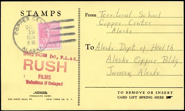 This is a mailing card for a can of film weighing between five and six pounds returning educational materials to the Alaska Department of Health in 1956.