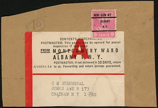 This portion of a wrapper comes from a package sent from Albany to Chatam, New York, roughly 31 miles, a Zone 1 distance. It apparently weighed a pound or less and was mailed in 1947, which would make the postage eight cents plus a one-cent surchage.