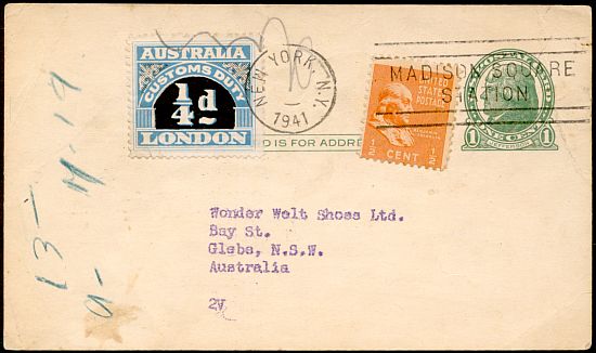 A half-cent Prexie used to pay the difference between the domestic postal card rate and the third-class foreign printed matter rate on an advertisement sent to Australia in 1941. The Australian Customs Duty stamp was applied at New York by the sender to pay the duty on incoming printed matter, as it would have been poor commercial strategy to ask the recipient to pay a tax to recieve an offer to send a survey of developments in shoe manufacturing.