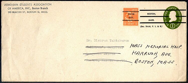 A third class printed matter bulk mailing made in 1953, according to a backstamp on the envelope. The phrase "Sec. 34.66, P. L. & R." to the right of the stamp was used from February 25, 1949 to July 1, 1954, and the minimum charge per piece was one-and-a-half cents from July 1, 1952 until January 1, 1959. The envelope would have been mailible for one cent prior to July 1, 1952 and was uprated by addition of the precancelled stamp for use in 1953.