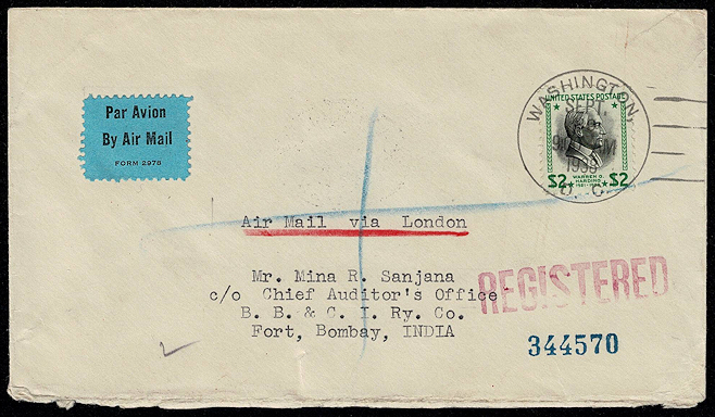 The addressee Sanjana was a philatelist, to judge from other covers sent to him that are pictured on the internet. This cover was sent at a complex rate, five and a half times the surface rate to London, five cents for the first ounce and three cents for each additional ounce, to a total of twenty cents. From London it went by air at fifteen cents per half ounce, for another $1.65. It was registered, for another fifteen cents. .20 + 1.65 + .15 = 2.00.
